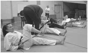 Anne développait la notion de relâchement et la manière d’y arriver. Le relâchement, c’est le mouvement. Associé à la respiration, on le perçoit mieux, on l’intègre mieux. Notre discipline martiale ne doit pas dissocier ces éléments fondamentaux, de la technique pure (kata, kihon, kumite). Il convient donc d’aborder ces thèmes le plut tôt possible et l’intégrer dans nos cours distinctifs.